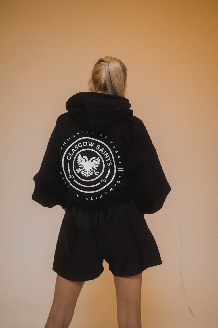 Our biggest seller. The Glasgow Saints 'community at heart' hoodie, featuring club crest on the front & 'community at heart' surrounding the large print crest on the back.